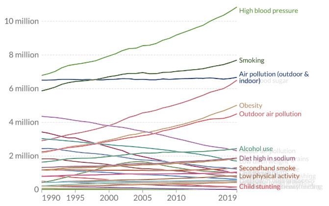 医学杂志《柳叶刀》上的一项关于死亡和疾病的原因和风险因素的重要全球研究,评估各种风险因素的年死亡人数。